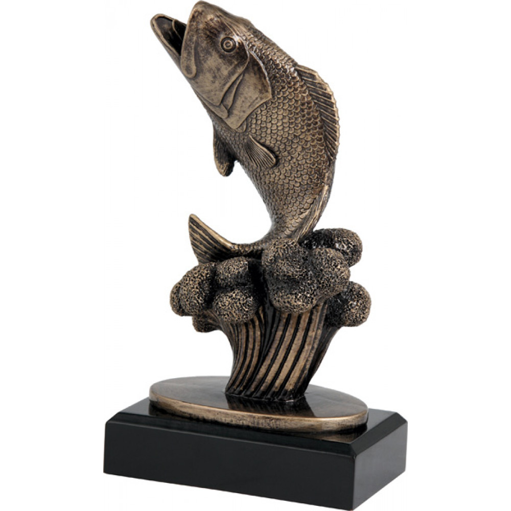 Фигурка литая "Рыболовство". Цвет бронза. Материал: пластик. Фигурка представляет собой рыбу в вертикальном положении, у рыбы открыт широко рот. Хвост рыбы на волнах. Волны представлены возвышением с вертикальными вдавленными полосами, на конце возвышения элементы в форме шаров с частыми вдавленными точками. Волны установлены на плоской подставке овальной формы. Цоколь фигурки прямоугольной формы, цвет черный.