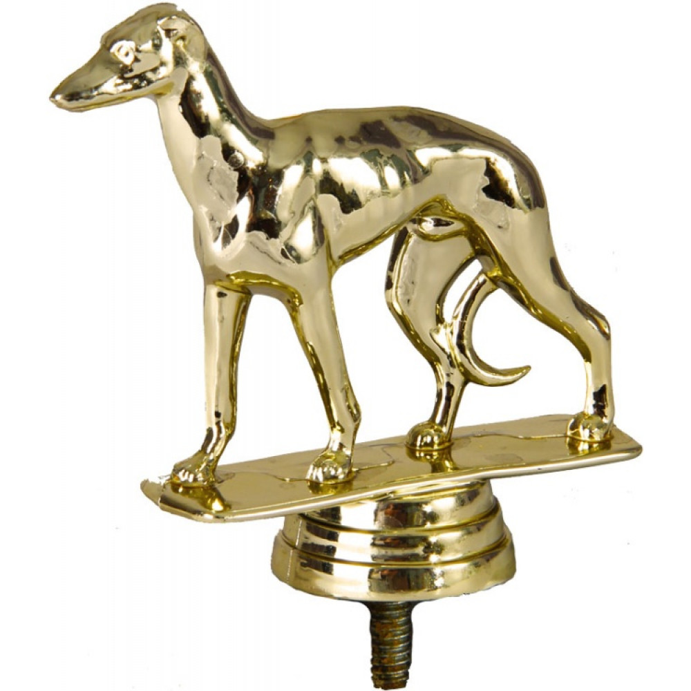 Цвет: золото, материал: пластик. Тема: собаки. Фигурка выполнена в виде собаки в движении. Её хвост опущен вниз. Собака жилистая, что указывает на то, что она гончая. У неё длинная морда с маленьким носом. Уши маленькие, так что их едва заметно. Собака находится на тонкой прямоугольной пластине – имитации земли. Ниже - круглое основание, на котором имеются горизонтальные линии. Высота, см: 10.2. Фигурку возможно закрепить на цоколь, постамент или кубок.