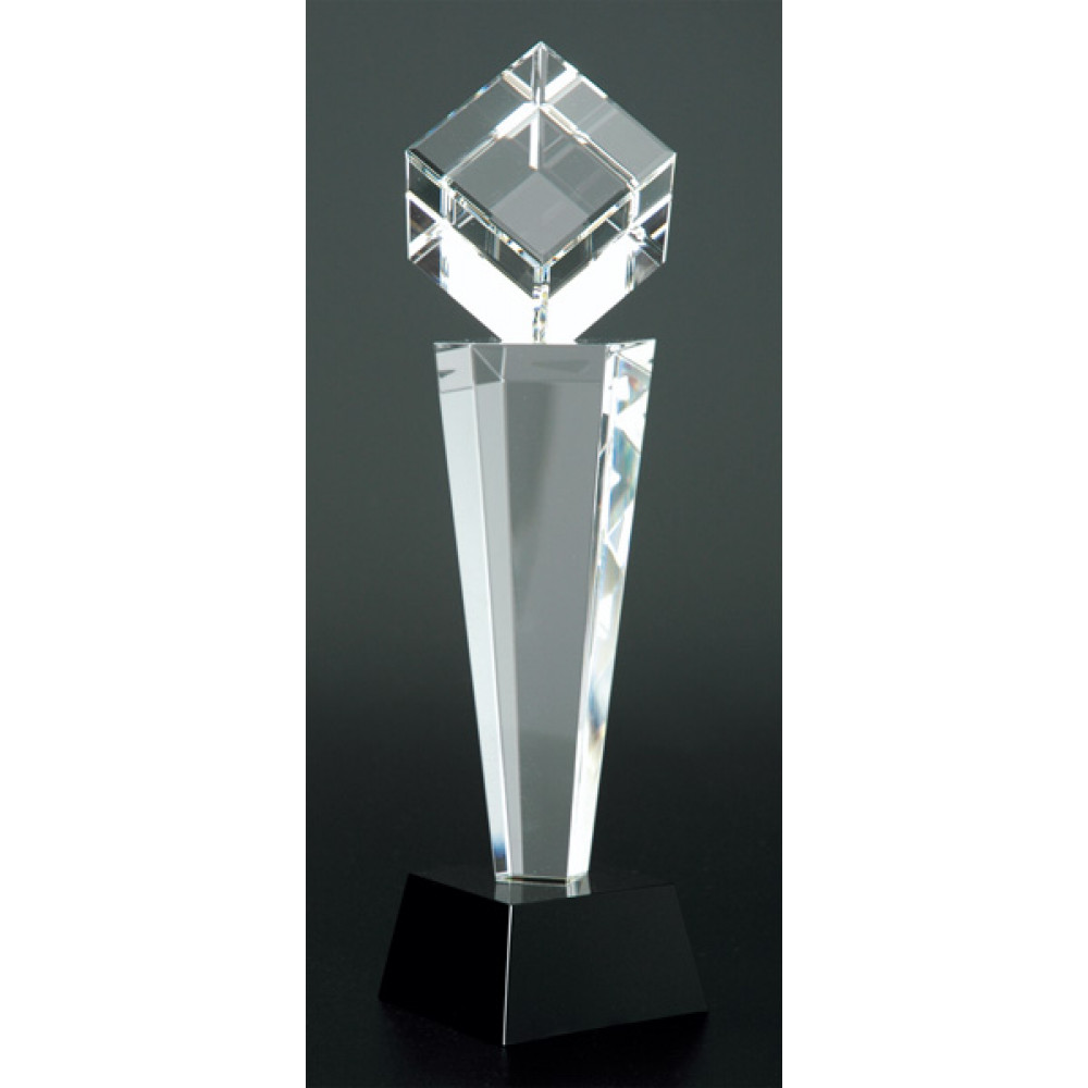 Награда хрустальная, прозрачная. Высота 30 см. Представляет собой сложную фигуру. Куб, стоящий на одном из углов, расположен на неравностороннем шестиугольнике, который установлен на цоколь черного цвета. Материал пластик. Цоколь в форме квадрата.