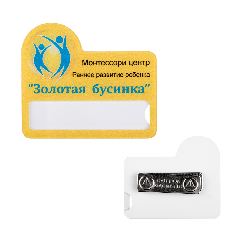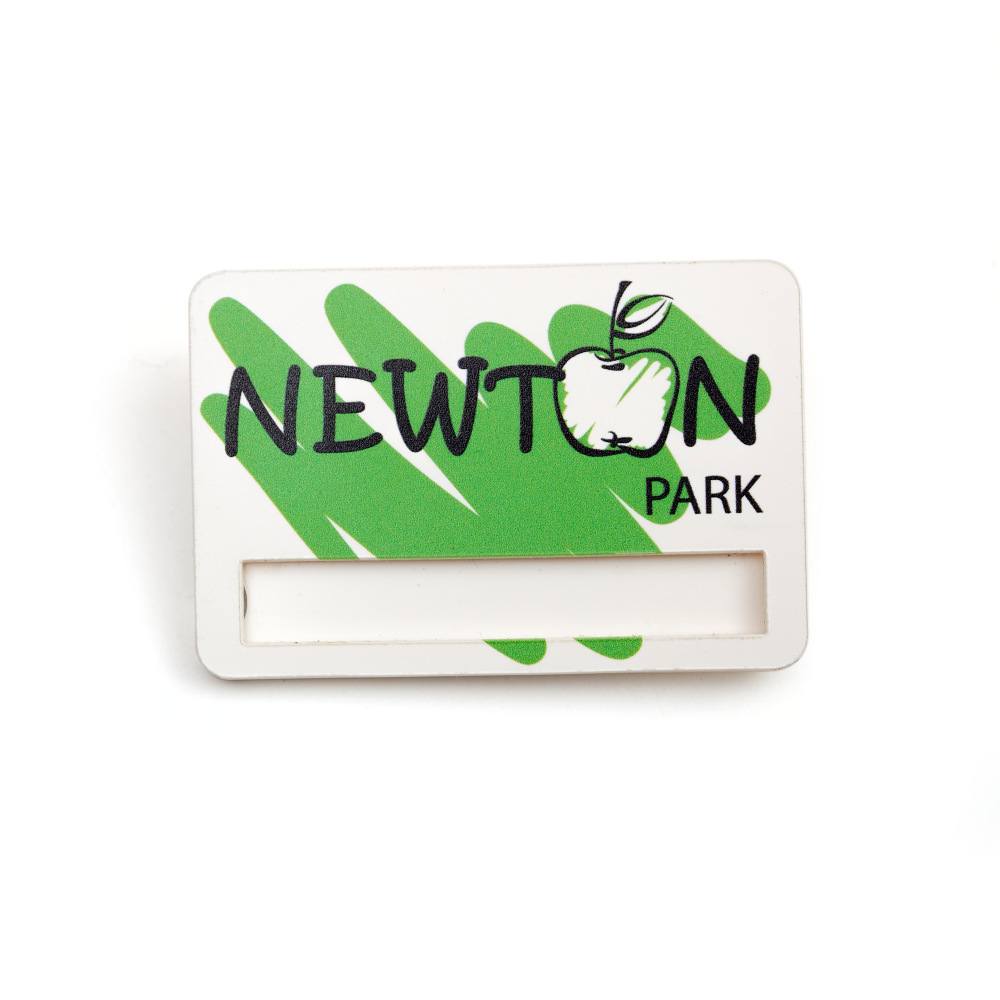 Материал бейджа – прозрачный или цветной акрил. Это практичный материал, стойкий к загрязнению и воде. Преимущество этого варианта – большой выбор цветов и оттенков акрила.