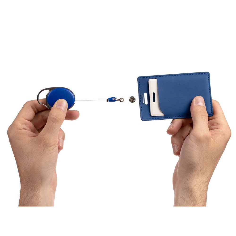 Ретрактор крепится к одежде с помощью карабина, а с другой стороны можно поместить бейдж, визитку или магнитную карту. В корпусе спрятан сворачивающийся шнур, который позволяет при необходимости демонстрировать содержимое держателя, не снимая его.