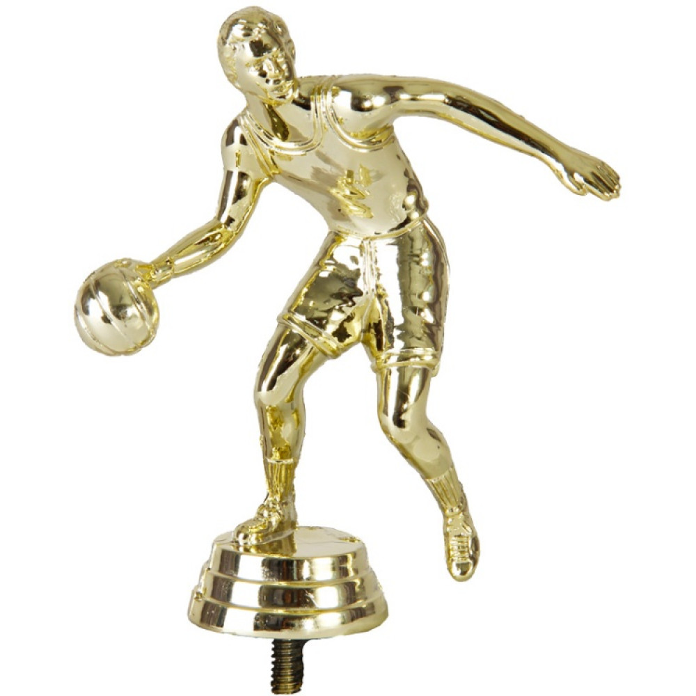 Цвет: золото, материал: пластик. Вид спорта: баскетбол. Фигурка выполнена в виде мужчины-баскетболиста. Левой рукой он ведёт мяч, правая рука вытянута в сторону. Голова спортсмена повернута в сторону, он неотрывно смотрит на цель. Его левая нога зависла в воздухе. Правая прижата к земле. Кажется, что баскетболист сейчас прыгнет и забросит мяч в кольцо. На спортсмене надета майка и длинные шорты. Ниже - круглое основание, на котором имеются горизонтальные линии. Высота, см: 12.1 Вес, кг: 0.045. Фигурку возможно закрепить на цоколь, постамент или кубок.