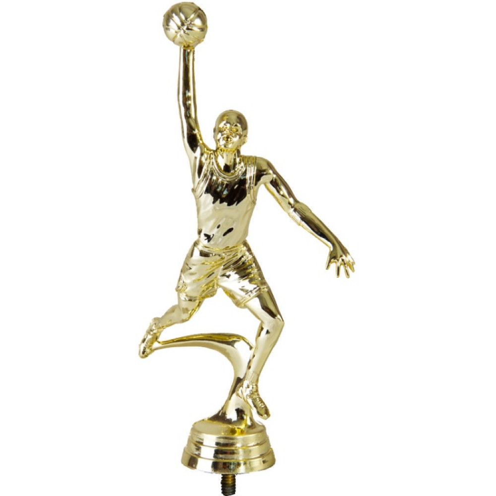 Цвет: золото, материал: пластик. Вид спорта: баскетбол. Фигурка выполнена в виде спортсмена-баскетболиста. Его правая рука с мячом вытянута вверх, ноги зависли в воздухе в процессе прыжка. Голова мужчины поднята вверх, взгляд направлен на цель. Кажется, ещё секунда и мяч будет в кольце. На мужчине надета спортивная майка и свободные шорты. Фигура находится на объёмном элементе, выполненном в виде полумесяца. Ниже - круглое основание, на котором имеются горизонтальные линии. Высота, см: 17.8 Вес, кг: 0.048. Фигурку возможно закрепить на цоколь, постамент или кубок.