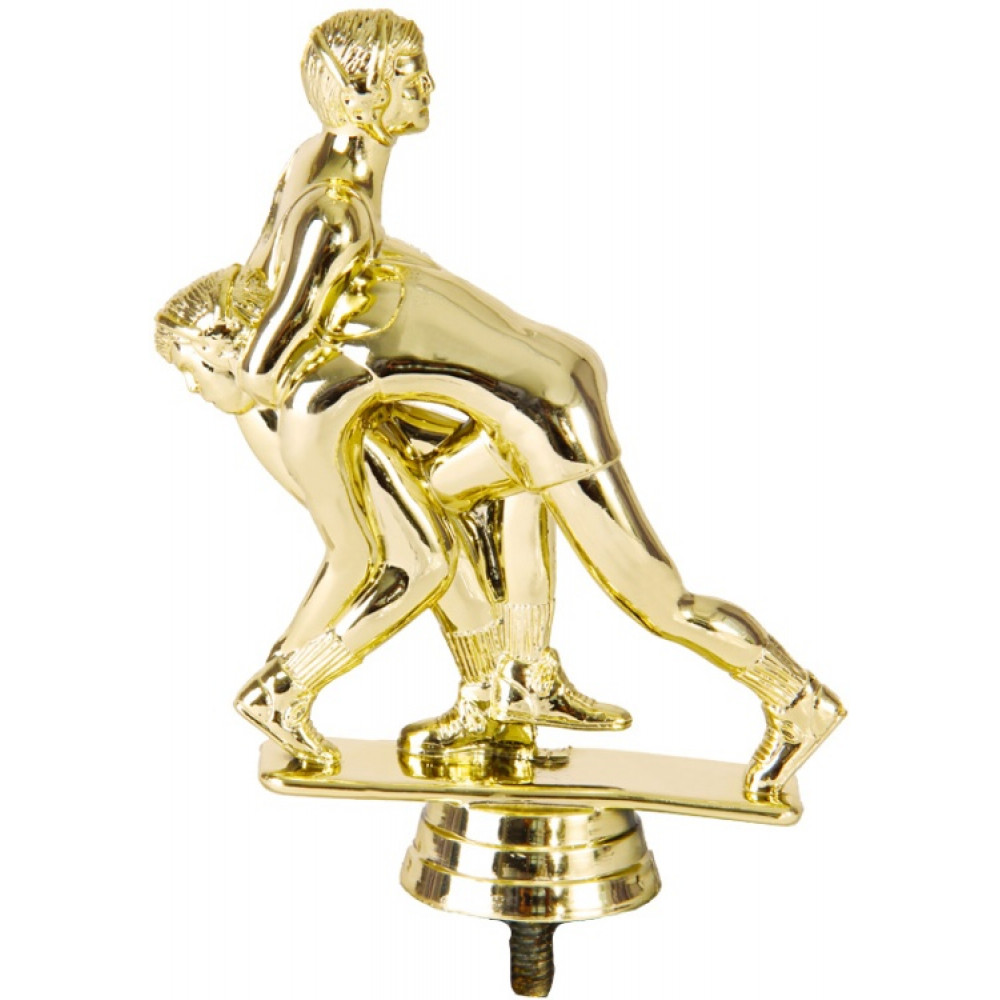 Цвет: золото, материал: пластик. Вид спорта: борьба. Фигурка выполнена в виде двух борцов, борющихся за победу. Борец снизу перекидывает второго бойца через плечо, его ноги согнуты для поддержания равновесия. Борец придерживает второго борца за ноги возле коленок, пытаясь перебросить его. Второй борец крепко держится за шею своего противника, желая одержать победу. Он отчаянно держится одной ногой за пол. Борцы находятся на тонкой прямоугольной пластине – имитации ринга. Ниже - круглое основание, на котором имеются горизонтальные линии. Высота, см: 12.1 Вес, кг: 0.061. Фигурку возможно закрепить на цоколь, постамент или кубок.