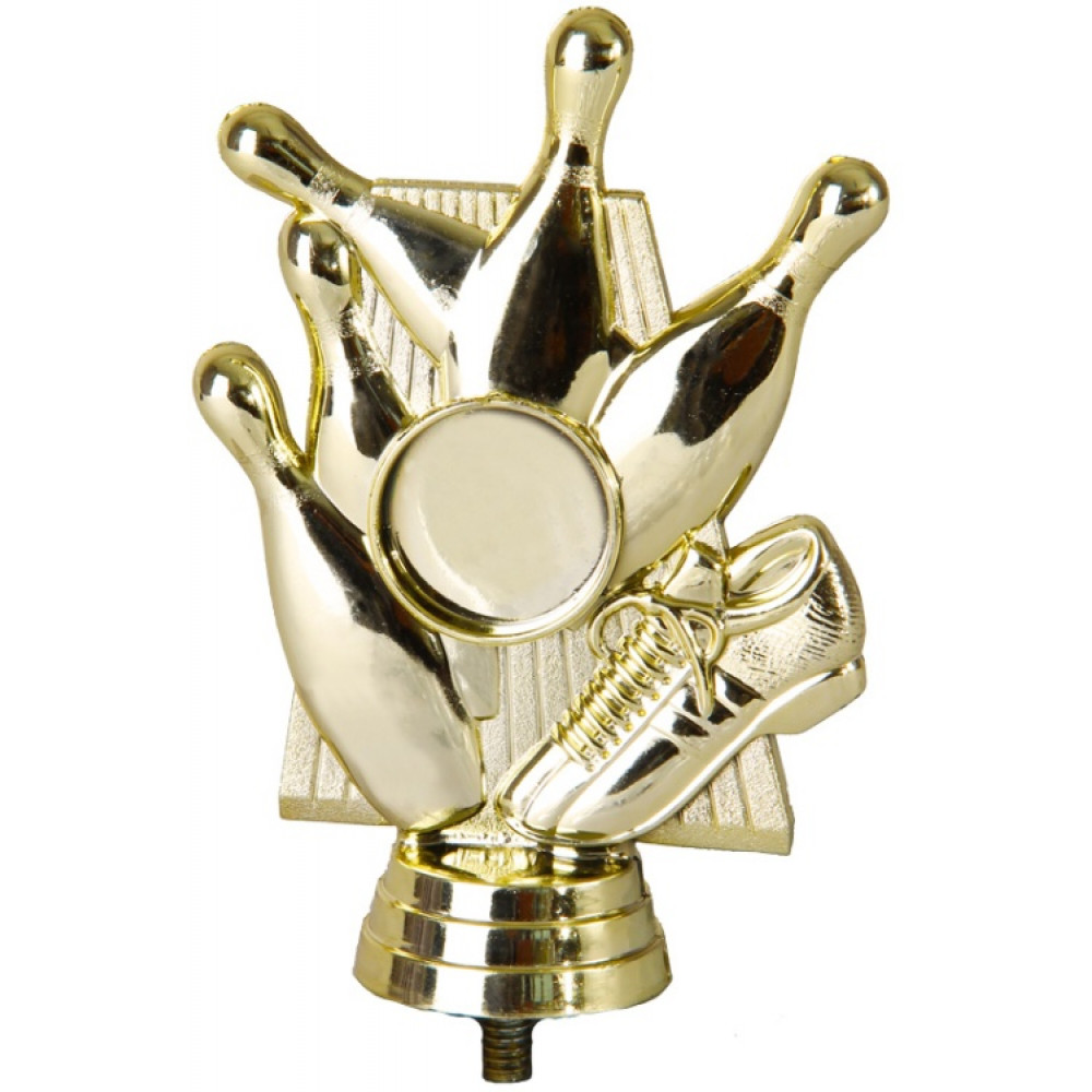 Цвет: золото, материал: пластик. Вид спорта: боулинг. Фигурка выполнена в виде дорожки для боулинга, на которой располагаются объёмные декоративные элементы в виде пяти кеглей и обуви для боулинга. По середине имеется место для нанесения персонализации, обрамлённое узким обручем. Фигурка выполнена в золотом цвете, что придаёт ей роскоши и уникальности. Ниже - круглое основание, на котором имеются горизонтальные линии. Высота, см: 11.4 Вес, кг: 0.055. Фигурку возможно закрепить на цоколь, постамент или кубок.