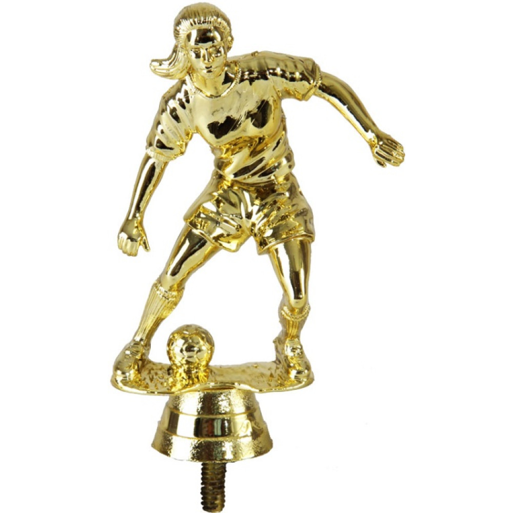 Цвет: золото, материал: пластик. Вид спорта: футбол. Фигурка выполнена в виде футболистки, готовой к удару. Ветер отбросил волосы назад. Её ноги согнуты в коленях и расставлены на ширине плеч. Правая рука согнута в локте, левая вытянута вдоль тела. Футболистка нагнулась к земле, от чего на футболке появились складки, шорты немного приподнялись вверх из-за бега. Игрок сконцентрировано смотрит на свою цель, не отводя взгляда. Левая нога немного повёрнута в сторону мяча, а правая прижата к земле. Футболистка находится на тонкой закруглённой по краям пластине – имитацией футбольного поля. Ниже - круглое основание, на котором имеются горизонтальные линии. Высота, см: 11.4 Вес, кг: 0.04. Фигурку возможно закрепить на цоколь, постамент или кубок.