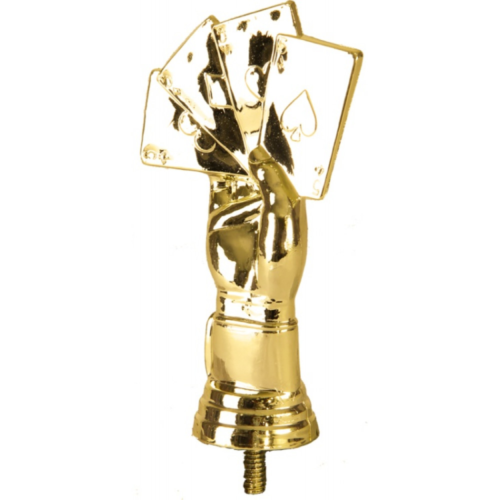 Цвет: золото, материал: пластик. Вид спорта: карты. Фигурка выполнена в виде руки, в пальцах которой зажаты игральные карты. На картах изображены все игральные масти: черви, буби, крести, пики. Ниже - круглое основание, на котором имеются горизонтальные линии. Высота, см: 11.7 Вес, кг: 0.04. Фигурку возможно закрепить на цоколь, постамент или кубок.