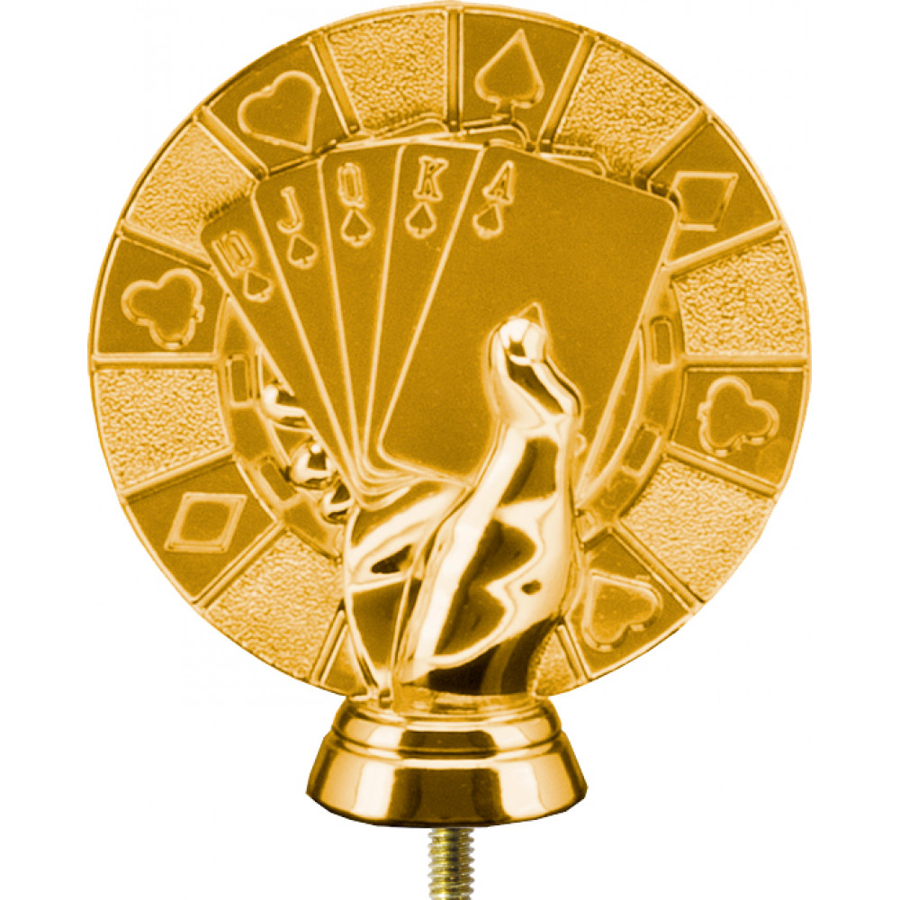 Фигурка пластиковая "Карты", "Казино". Цвет золото. Высота 9,5 см. Изображена "рулетка" и поверх нее рука, держащая 5 карт. Фигурка установлена на стеме в виде небольшого элемента конусообразной формы. Фигурку возможно закрепить на цоколь, постамент или кубок.