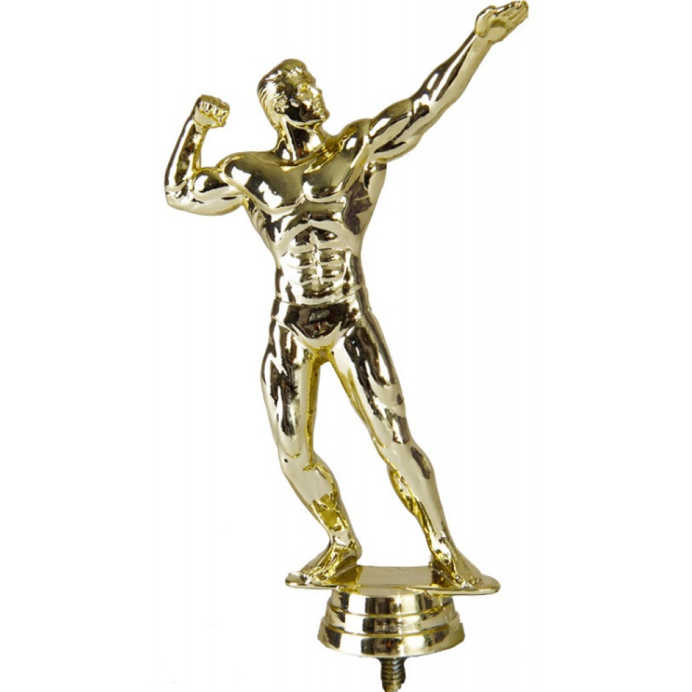 Цвет: золото. Материал: пластик Вид спорта: культуризм. Фигурка выполнена в виде мужчины с сильным, накаченным телом. Упругие мышцы выступают под кожей. Его левая рука поднята высоко вверх, пальцы выпрямлены. Вторая рука согнута в локте, пальцы сжаты в кулак, отчего мышцы становятся более отчётливыми. Голова мужчины повернута в сторону, взгляд устремлён на левую руку. Левая нога отставлена в сторону, правая согнута в колене. Его ступни большие, с длинными пальцами. Атлет находится на тонкой пластине – имитации пола. Ниже - круглое основание, на котором имеются горизонтальные линии. Фигурку возможно закрепить на цоколь, постамент или кубок.