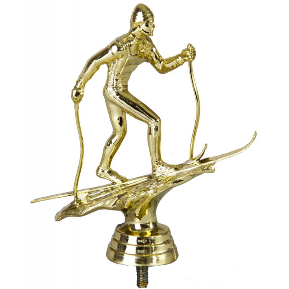 Цвет: золото, материал: пластик. Вид спорта: лыжи. Фигурка представлена в виде мужчины- лыжника. Он опирается на лыжные палки, на ногах спортсмена – лыжи. Лыжник согнул руки, отталкиваясь от земли. Он тепло одет: на голове шапка, на теле – костюм, защищающий от холода. Ощущение движения создаётся за счёт согнутых коленей лыжника и приподнятых пяток. Лыжник находится на тонкой пластине – имитации земли, припорошенной снегом. Ниже - круглое основание, на котором имеются горизонтальные линии. Высота, см: 14. Фигурку возможно закрепить на цоколь, постамент или кубок.