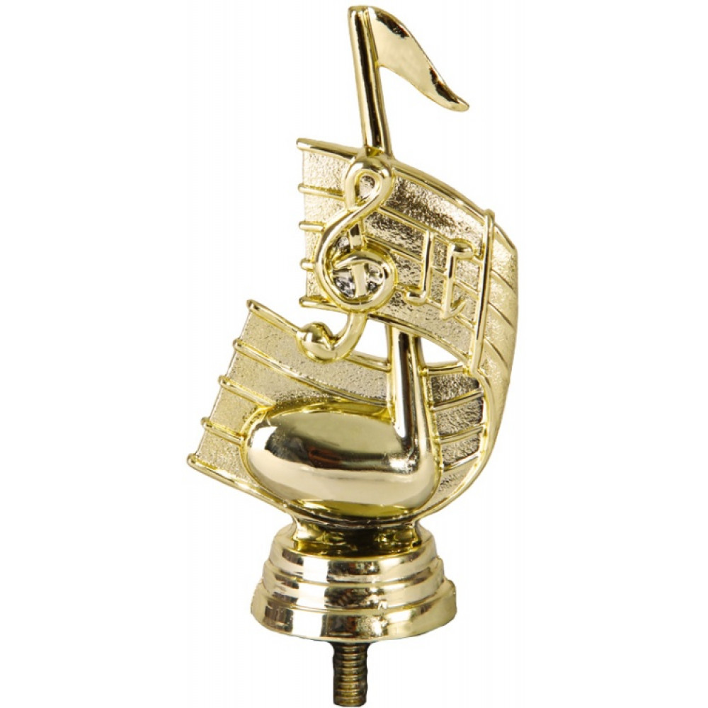 Цвет: золото, материал: пластик. Тема: музыка. Фигурка выполнена в виде музыкальной ноты, окружённой нотным станом. На лицевой стороне нотного стана изображен скрипичный ключ и две ноты. Фигурка выполнена в золотом цвете. В нижней части - круглое основание, на котором имеются горизонтальные линии. Высота, см: 10.8 Фигурку возможно закрепить на цоколь, постамент или кубок.