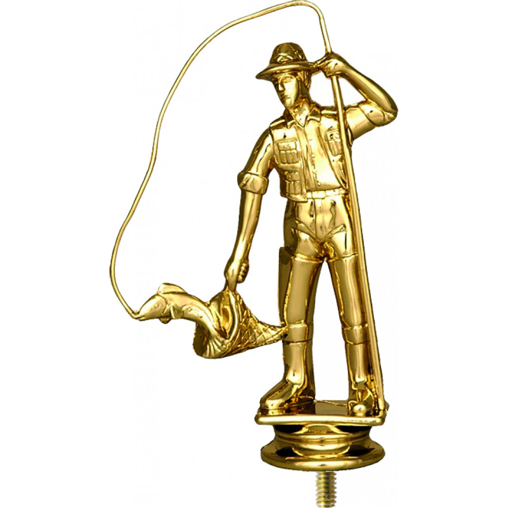 Фигурка пластиковая "Рыболов". Цвет золото. Высота 14 см. Изображен рыболов, одет в рубашку с закатанными рукавами, штаны, высокие сапоги, шляпу. В левой руке держит удочку, в правой-сачок, которым ловит рыбу.¶Фигурка установлена на стеме в виде небольшого элемента конусообразной формы. Фигурку возможно закрепить на цоколь, постамент или кубок.