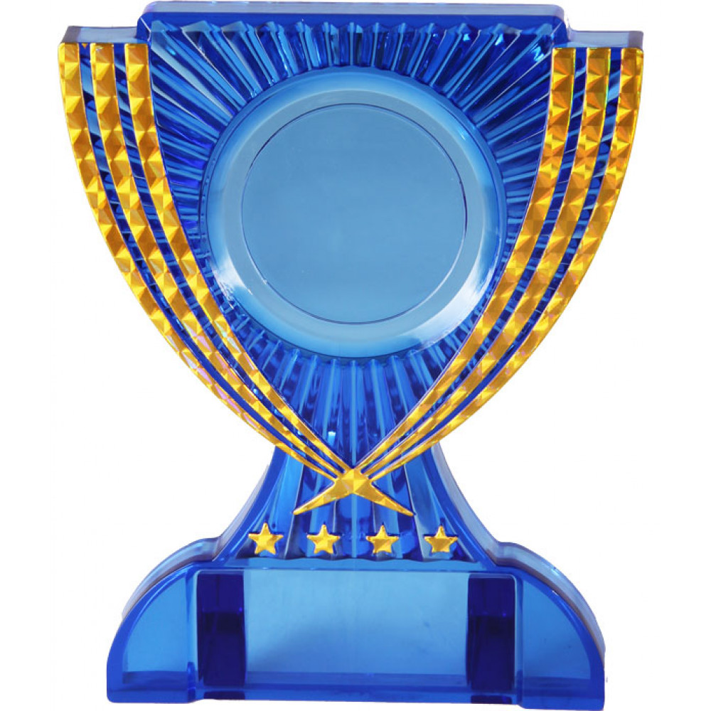 Цвет: синий, материал: пластик. Вид спорта: футбол. Фигурка выполнена в виде трофея, напоминающего перевёрнутый треугольник синего цвета. По середине имеется место для нанесения персонализации круглое по форме, место на эмблему, мм: 50. От эмблемы отходят объёмные линии. По краям фигурку с обеих сторон обрамляют три вертикальные линии золотого цвета, они соединяются воедино внизу и скрещиваются. Ниже выполнены четыре золотых звезды. Фигурку завершает трапеция синего цвета. По середине неё имеется вдавленный прямоугольник - ещё одно место для нанесения персонализации. Высота, см: 14 Вес, кг: 0.115.