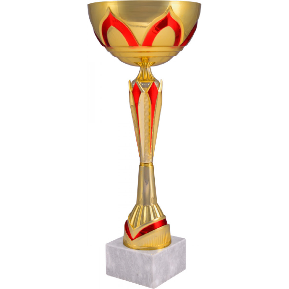 Кубок состоит из трех элементов: чаша, стем, цоколь. ¶Чаша кубка изготовлена из стали, с гальваническим покрытием. Цвет внутри и снаружи - золото. Форма чаши - полушар. Чаша имеет рельеф по всей окружности в форме куполов с контуром красного цвета, в количестве 6 штук. Под куполами у основания чаши расположены вдавленные линии, идущие по окружности.¶Стем состоит из трех элементов, цвет золото. Верхняя часть стема в форме конуса с рельефными вертикальными полосками одинаковой длины, переходящие в широкое кольцо с орнаментов в виде точек по низу по всей окружности. Средняя часть стема имеет форму перевернутого конуса. В верхней части элемента расположены выступающие треугольники красного цвета в количестве 6 штук по всей окружности. Нижняя часть стема имеет конусообразную форму. Внизу расположен вогнутый элемент в форме "галочки" красного цвета.¶Цоколь кубка имеет квадратную форму. Материал - мрамор. Цвет - белый, неоднородный.