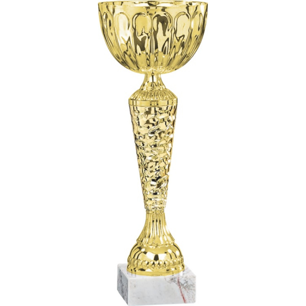 Кубок состоит из трех элементов: чаша, стем, цоколь. ¶Чаша кубка изготовлена из стали, с гальваническим покрытием. Цвет внутри и снаружи - золото. Чаша имеет декоративный рельеф, в виде толстых вертикальных полос, идущих от основания чаши к её краям. Стем кубка составной. Изготовлен из металлизированного пластика. Верхняя часть стема имеет накладку в виде элемента с тремя острыми углами сверху. Элемент украшен красной линией, повторяющей форму фигуры. В середине данной части расположено место вставку, диаметром 25 мм. По окружности место под вставку украшают два тонких красных круга. Нижняя часть стема имеет форму конуса. Гладкая часть стема переходит в рельефный декор по окружности стема в виде выпуклых ромбиков золотого цвета. Цоколь кубка имеет квадратную форму. Материал - мрамор. Цвет - белый.
