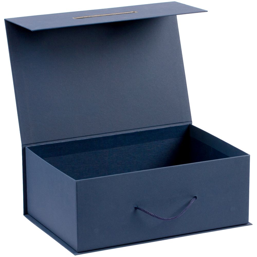 Коробка выполнена из переплетного картона, кашированного дизайнерской бумагой Malmero «Благородный синий», с крышкой на магните.
