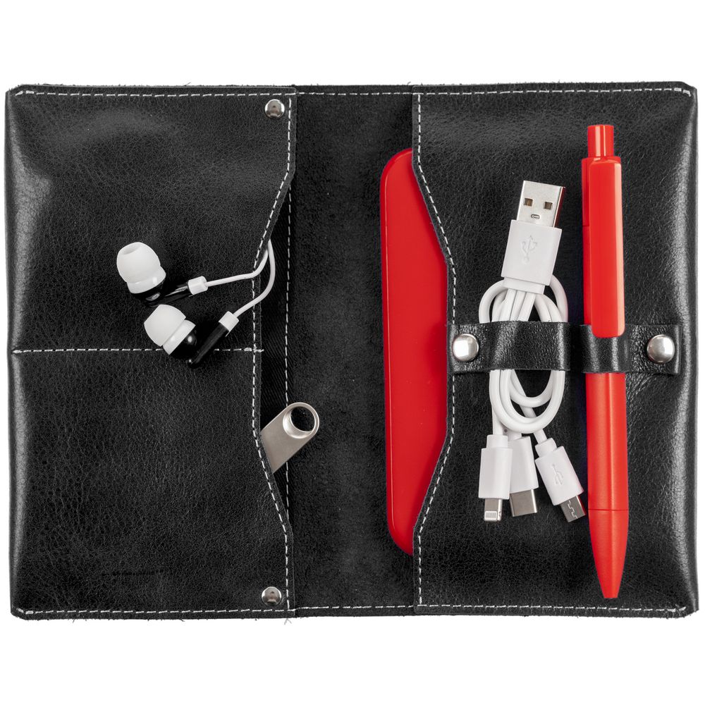 В органайзере есть два крепления на кнопке и четыре кармана разных размеров для проводов, наушников и зарядных устройств.