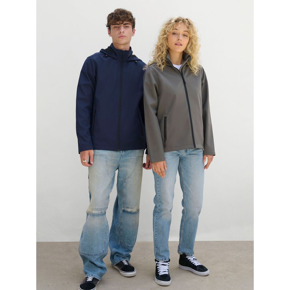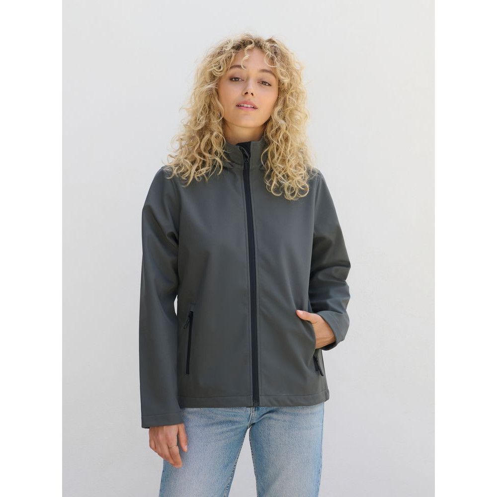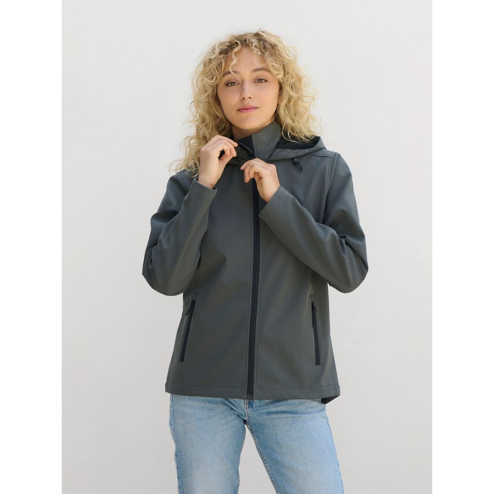 Женская куртка софтшелл на молнии и с капюшоном.