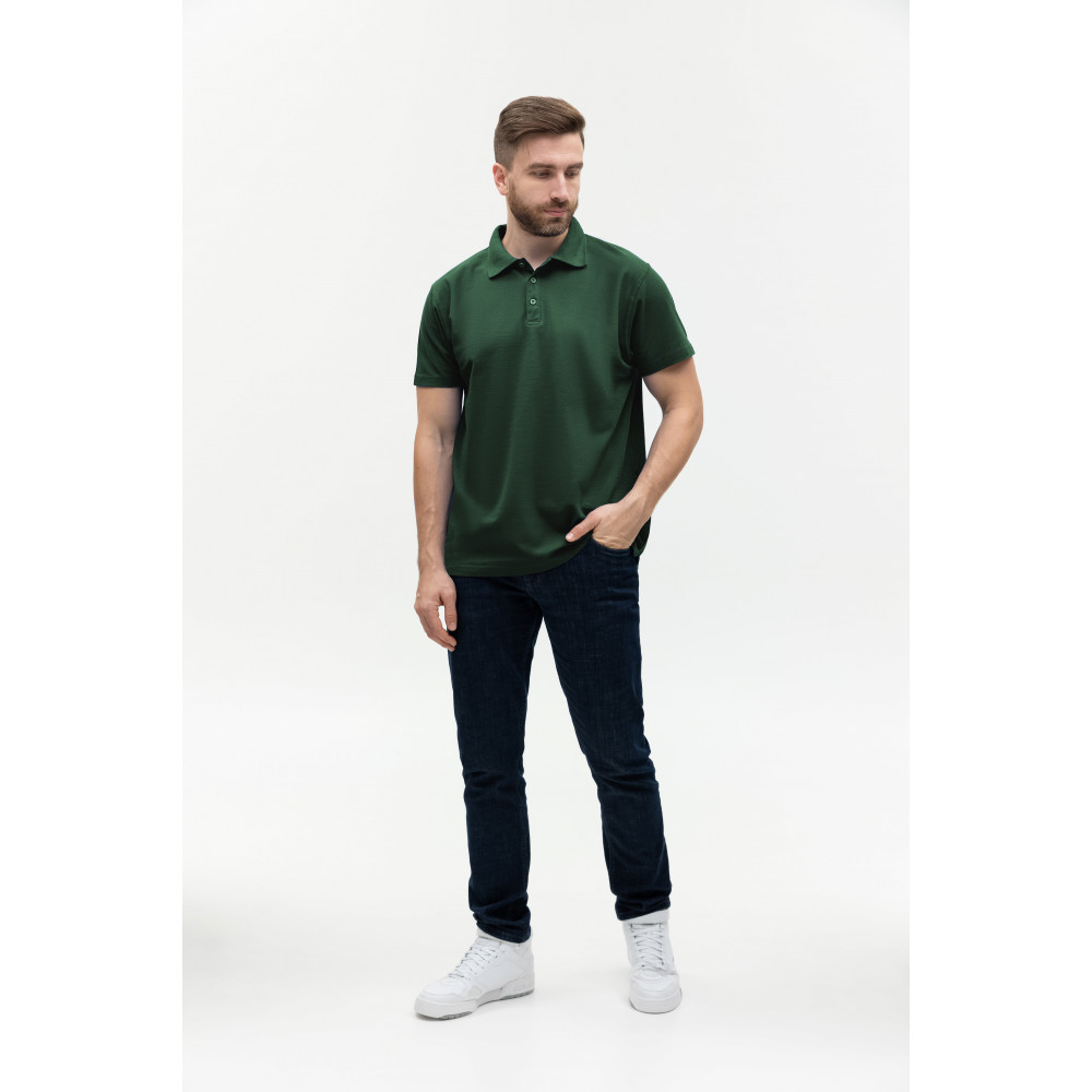 Поло выполнено из фактурной смесового ткани (65% хлопок, 35% полиэстер), благодаря чему изделие хорошо пропускает воздух и практически не мнется.