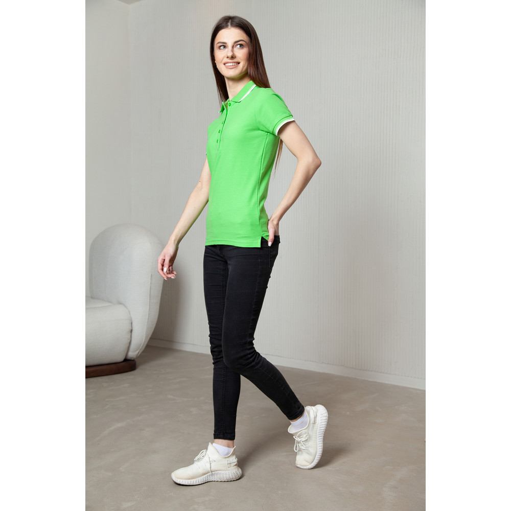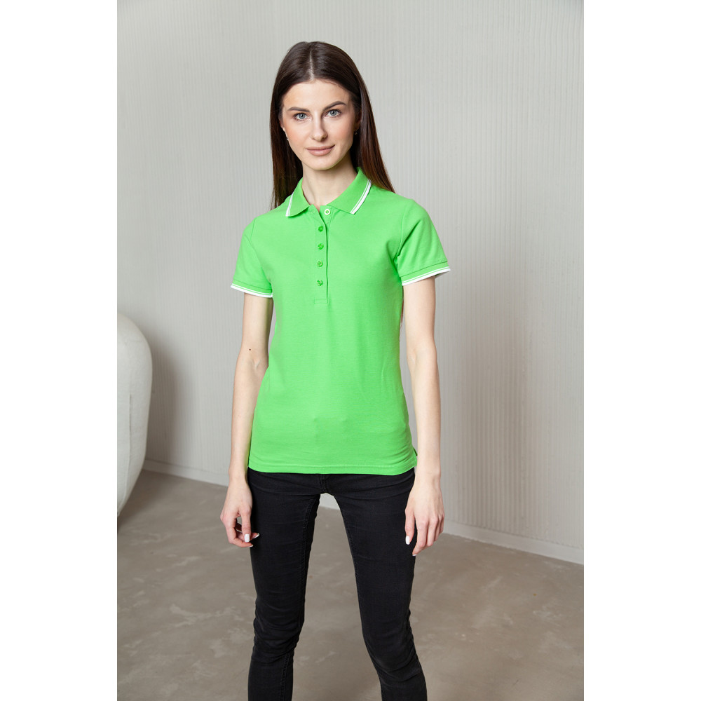 Женское поло приталенного силуэта с отложным воротником, втачным коротким рукавом и застежкой на пуговицы. Воротник и манжет выполнены контрастной резинкой.