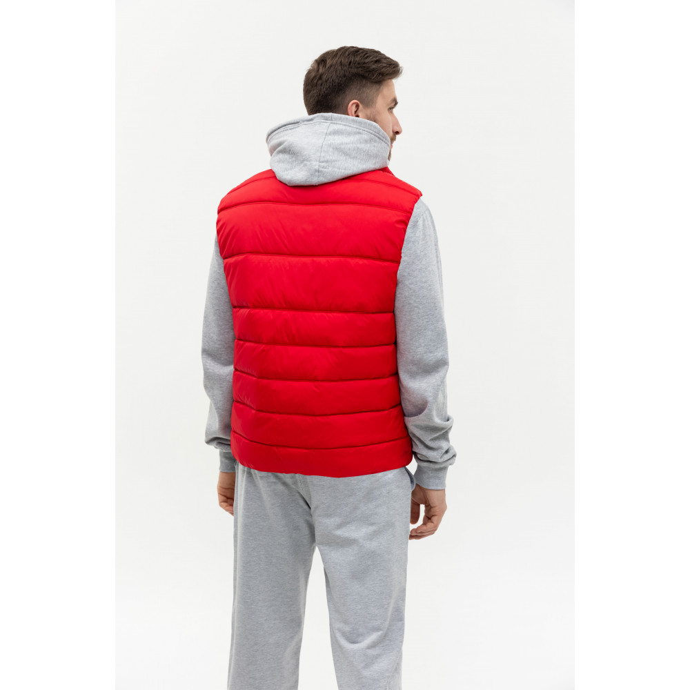 Мужской жилет прямого силуэта с геометричной стежкой, воротником-стойкой, прорезным карманом и застежкой на молнию. Изделие дополнено контрастной резинкой по пройме и линии низа для дополнительной защиты от холода и ветра.
