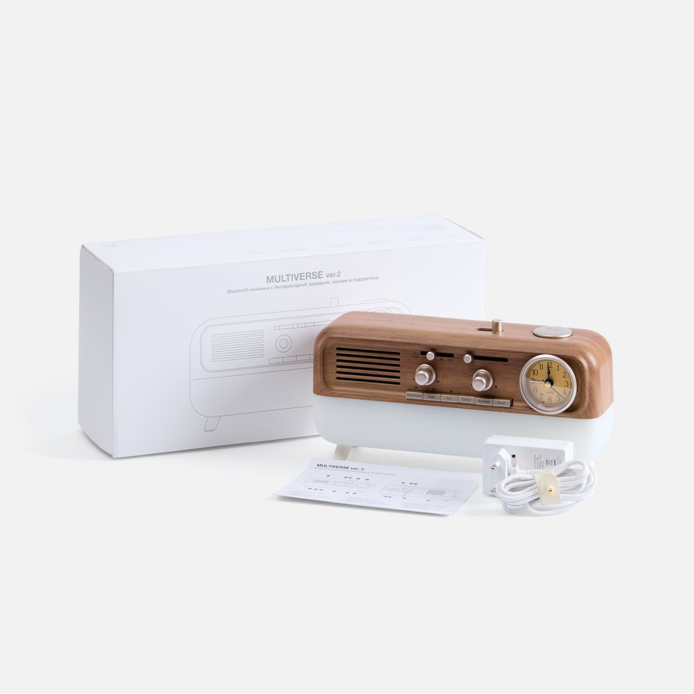 Bluetooth-колонка с аналоговыми часами Multiverse сразу привлекает внимание своей формой, напоминающей радиолу. Несмотря на ретро-стилистику, это современное и многофункциональное устройство.