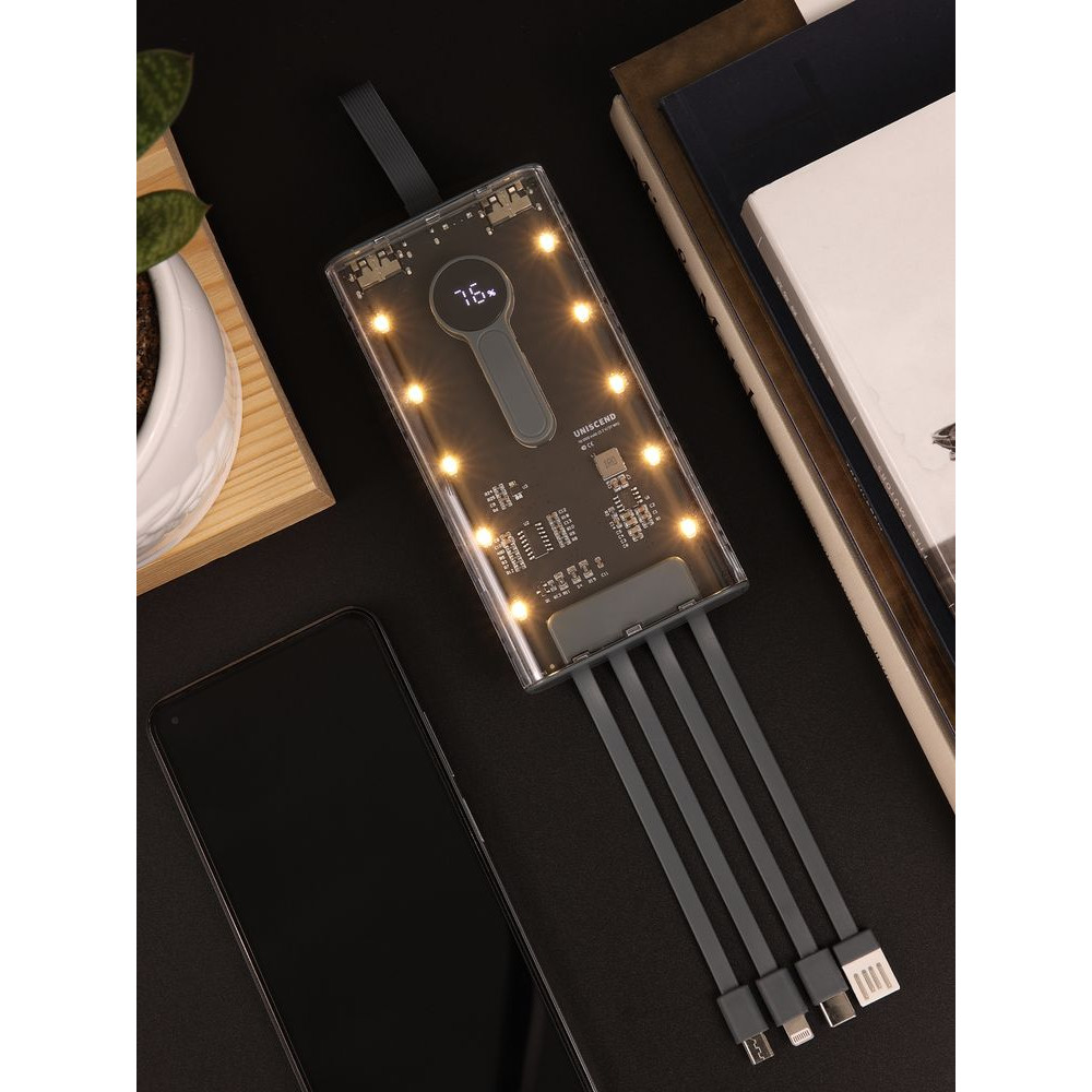 Необычный дизайн коллекции Uniscend Trellis выгодно выделяет новую серию устройств из прозаичного ряда внешних аккумуляторов. Они не поддерживают беспроводную зарядку, зато точно привлекают внимание: под прозрачной панелью хорошо видны электронная начинка и цифровой индикатор оставшегося в аккумуляторе заряда, а мягкая светодиодная подсветка теплого оттенка дополняет технологичный внешний вид.