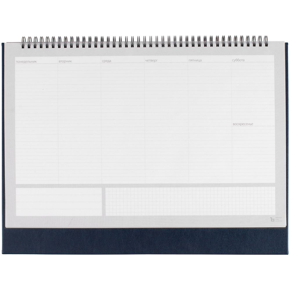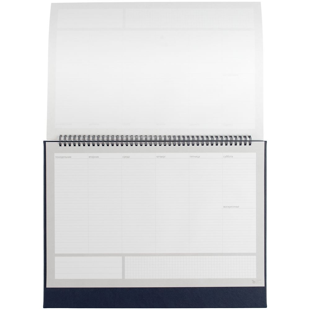 Настольный недатированный планер на открытой пружине. Обложка из белого мелованного картона, подложка из плотного картона в материале Petrus, тёмно-синий XX.