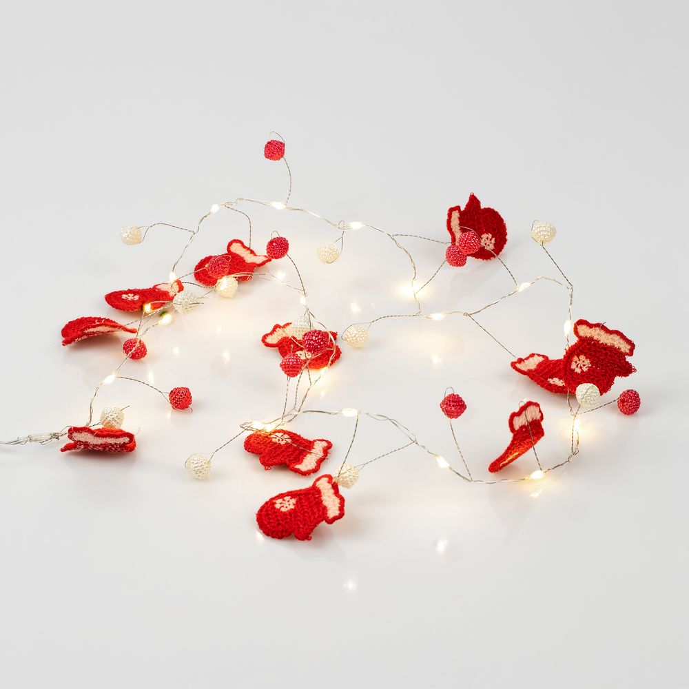 12 варежек, бусины и 20 лампочек с теплым светом. Работает от 2 батареек АА (в комплект не входят).