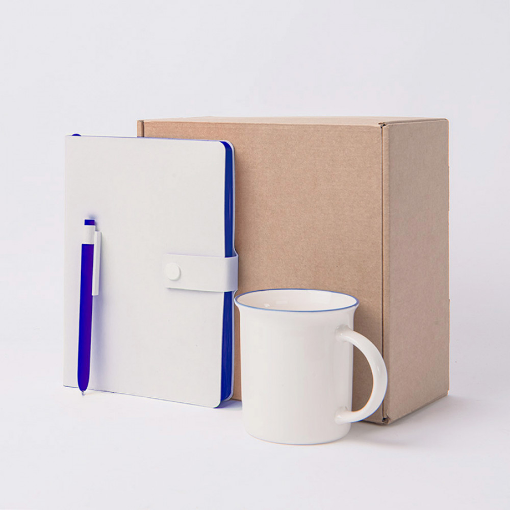 Набор подарочный : кружка, блокнот, ручка, коробка, стружка, белый с синим