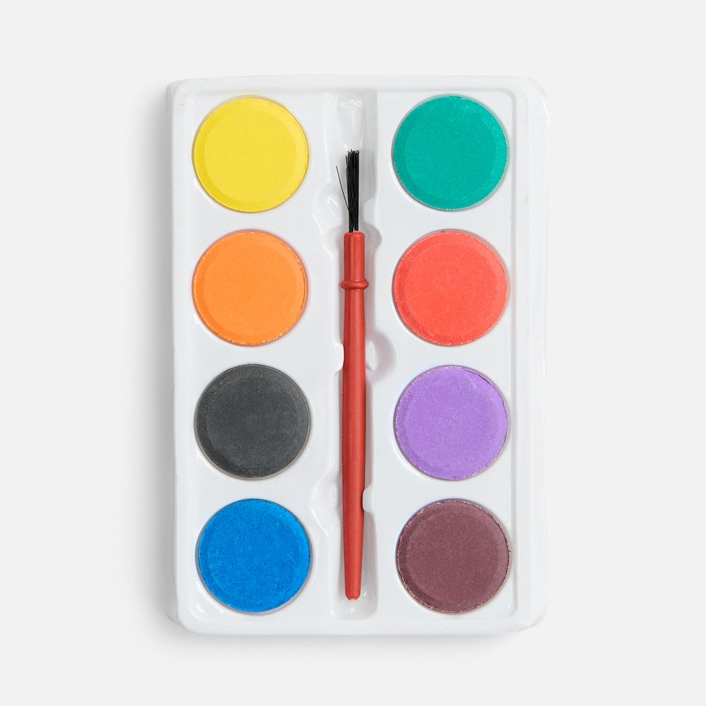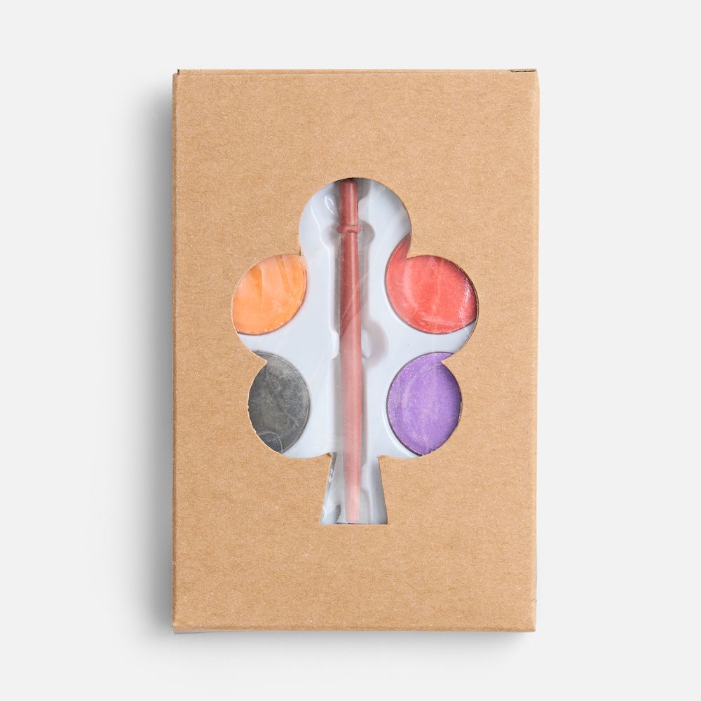 Набор из 8 акварельных красок и кисточки в коробке из крафт-бумаги.