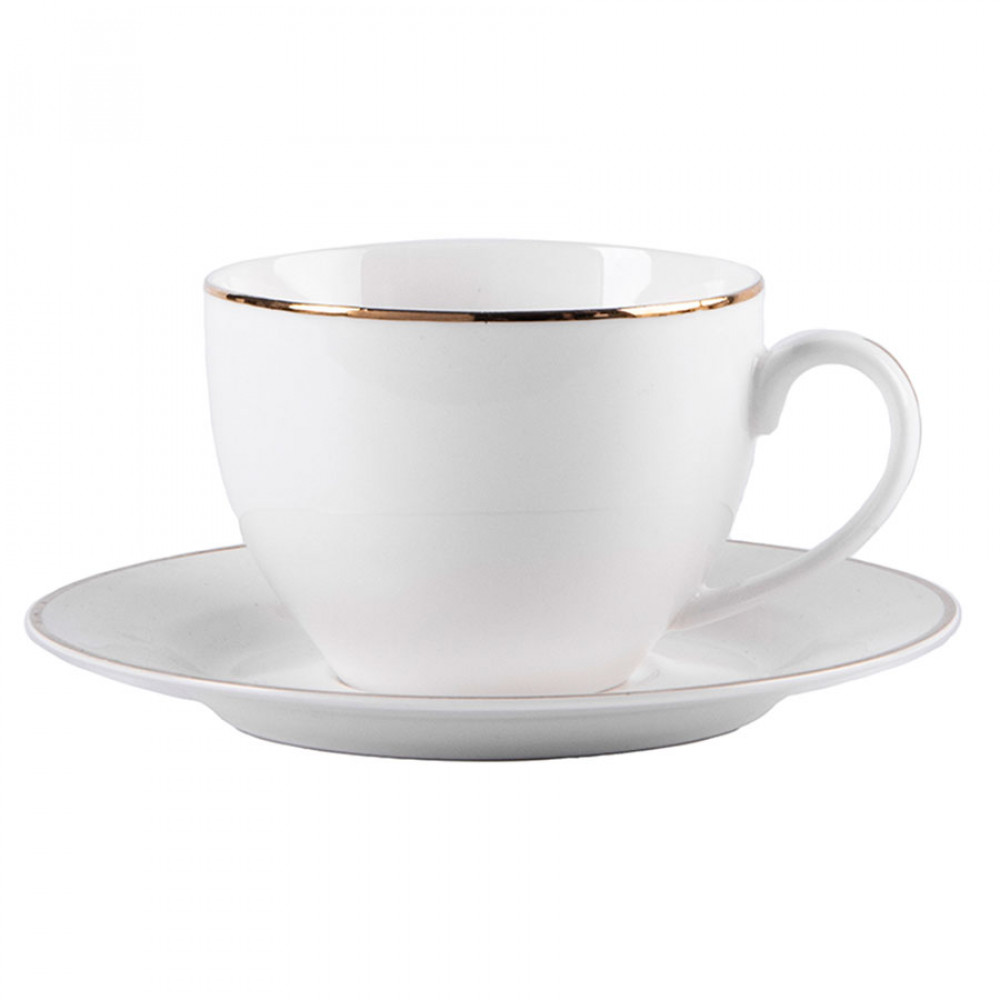 Эстетичная чайная пара из костяного фарфора, способна передать дух императорского времени. Материал - костяной фарфор,содержит в своем составе примеси обожженной костяной муки. Набор выделяется особой воздушностью и элегантностью. За счет материала стенки чашки на порядок тоньше обычного фарфора, при этом не теряя прочности. Блюдце имеет удобную выемку, которая не дает чашке скользить. Обе части набора оформлены позолоченным кантом.