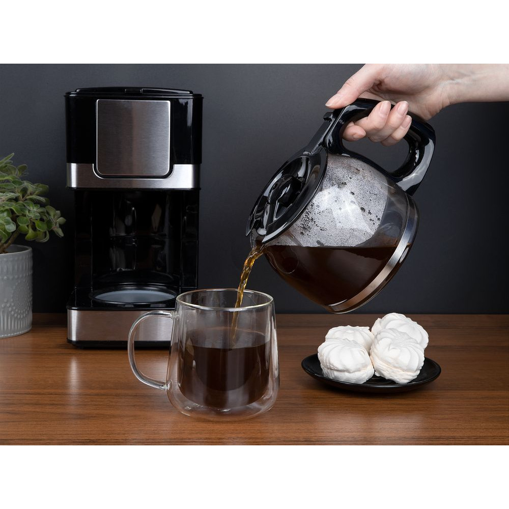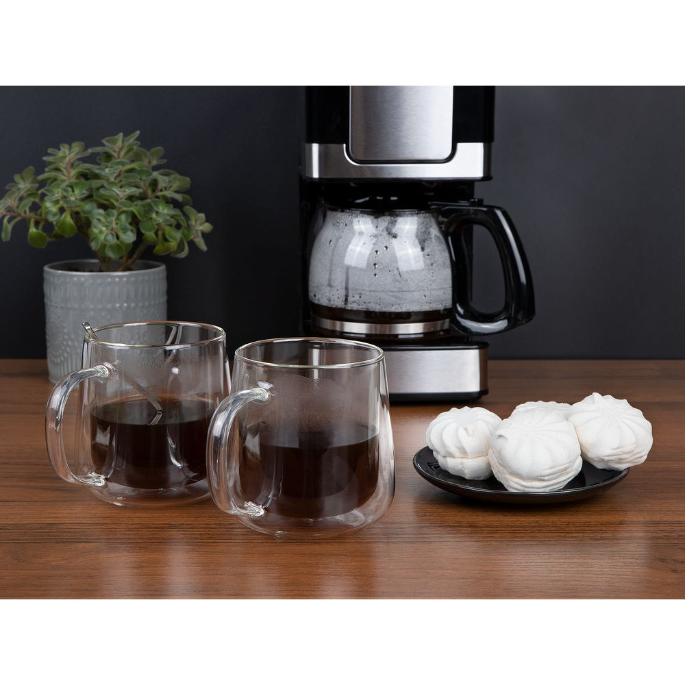 Зауженная сверху чашка Glass First производит впечатление очень аккуратной и совсем небольшой, но при этом точно понравится любителям больших кружек. Благодаря двойным стенкам из тонкого боросиликатного стекла кружка практически ничего не весит, отлично сохраняет тепло и вмещает целых 350 мл любимого напитка. Большая ручка удобно ложится даже в мужскую руку.