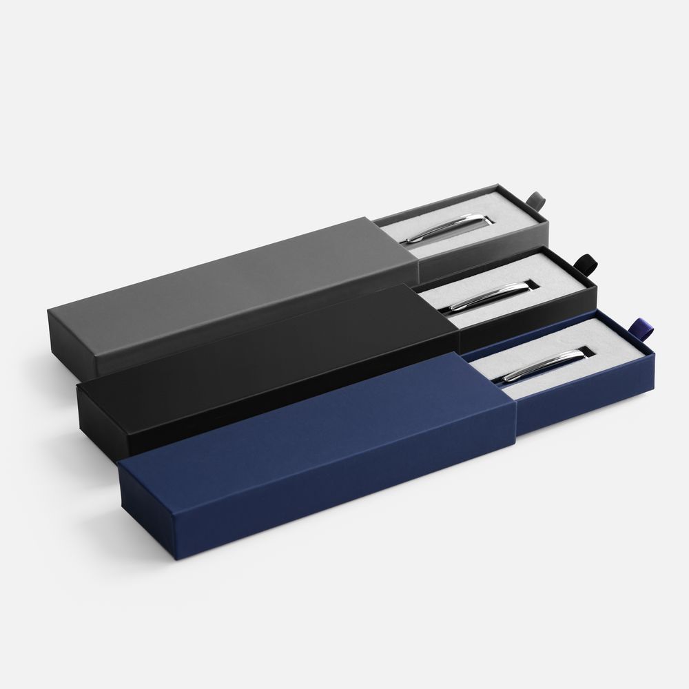 Картонный футляр с покрытием софт-тач с флокированным ложементом для одной ручки.