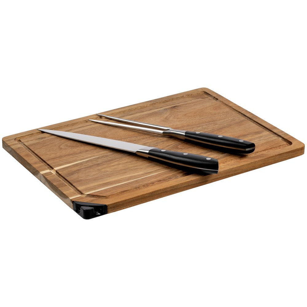 Доска с желобком, нож-слайсер для нарезки ломтиками и разделочная вилка — отличный подарок для человека, любящего готовить и красиво подавать на стол мясо, птицу или рыбу.