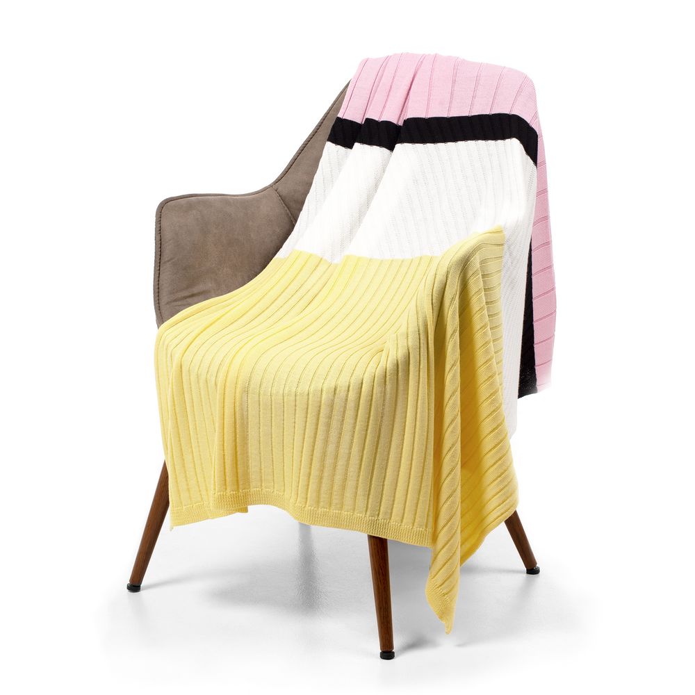 Яркий полушерстяной плед фактурной вязки Friolenta освежит современный интерьер: широкие контрастные линии создадут цветовой акцент в лаконичном дизайне спальни или гостиной.